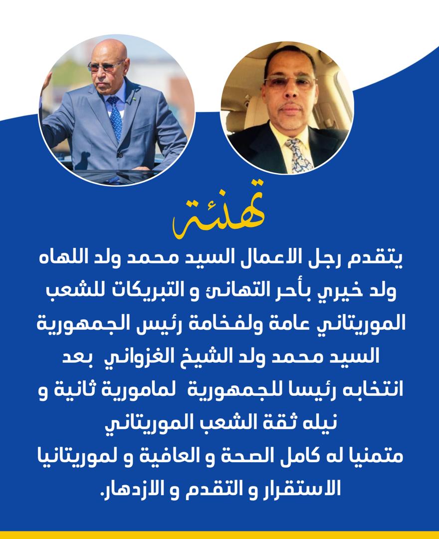 هنأ رجل الأعمال محمد ولد اللهاه ولد خيري فخامة رئيس الجمهورية السيد محمد ولد الشيخ الغزواني بمناسبة انتهابه رئيسا للجمهورية لمأمورية جديدا سائلا المولي جل وعلي أن ينعم علي بلدنا نعمة الأمن والاستقرار والتقدم والنماء .