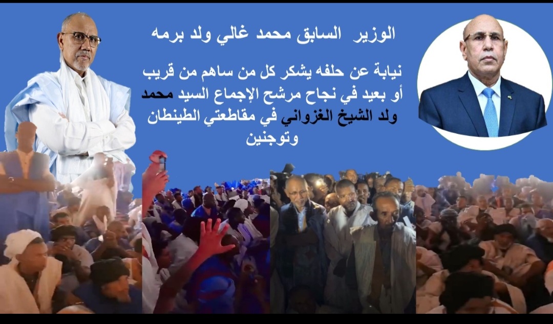 قدم الاطار والفاعل السياسي وزير الداخلية السابق السيد : محمد غالي ولد إشريف أحمد ولد برمه بسمه و نيابة عن حلفه الكبير في مقاطعتي الطينطان في الحوض الغربي ومقاطعة توجنين في انواكسوط أطيب الأمنيات والشكر والتقدير لحلف