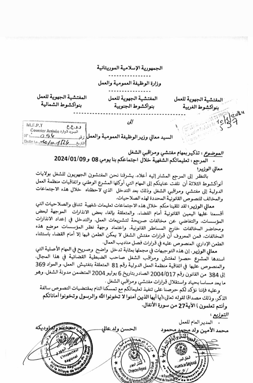 الأخبار ميديا : إتهم مجموعة من مفتشي الشغل في ولايات نواكشوط الثلاثة وزير الوظيفة العمومية والشغل بتعطيل النصوص القانونية والخضوع لاملاءات الأجانب العاملين في البلاد جاء ذلك في رسالة موجهة للسيد الوزير ، جاء ذلك بطلب ا