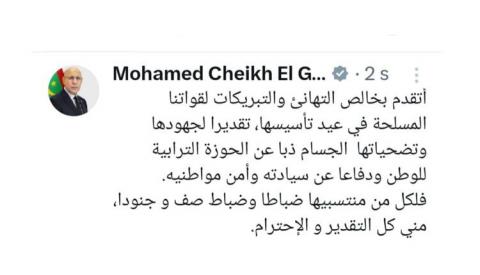 هنأ فخامة رئيس الجمهورية السيد محمد ولد الشيخ الغزواني، القوات المسلحة، بمناسبة عيد تأسيسها.