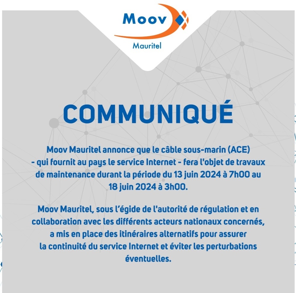 تعلن موف موريتل أن الكابل البحري (ACE) - المزود للبلاد بخدمة الانترنت- سيخضع لأعمال صيانة خلال الفترة من 13 يونيو 2024 السابعة صباحا إلى 18 يونيو 2024 الثالثة صباحا.