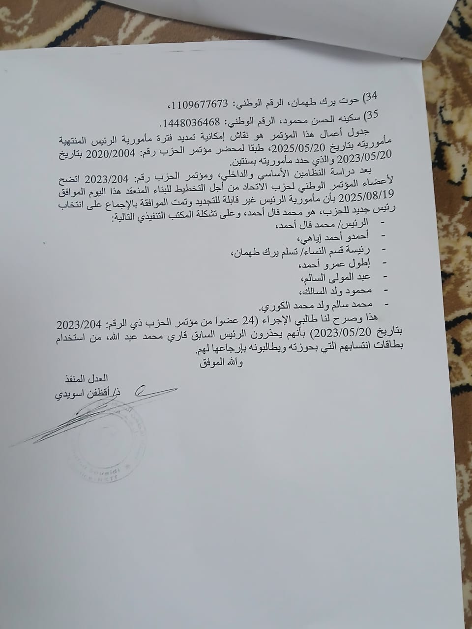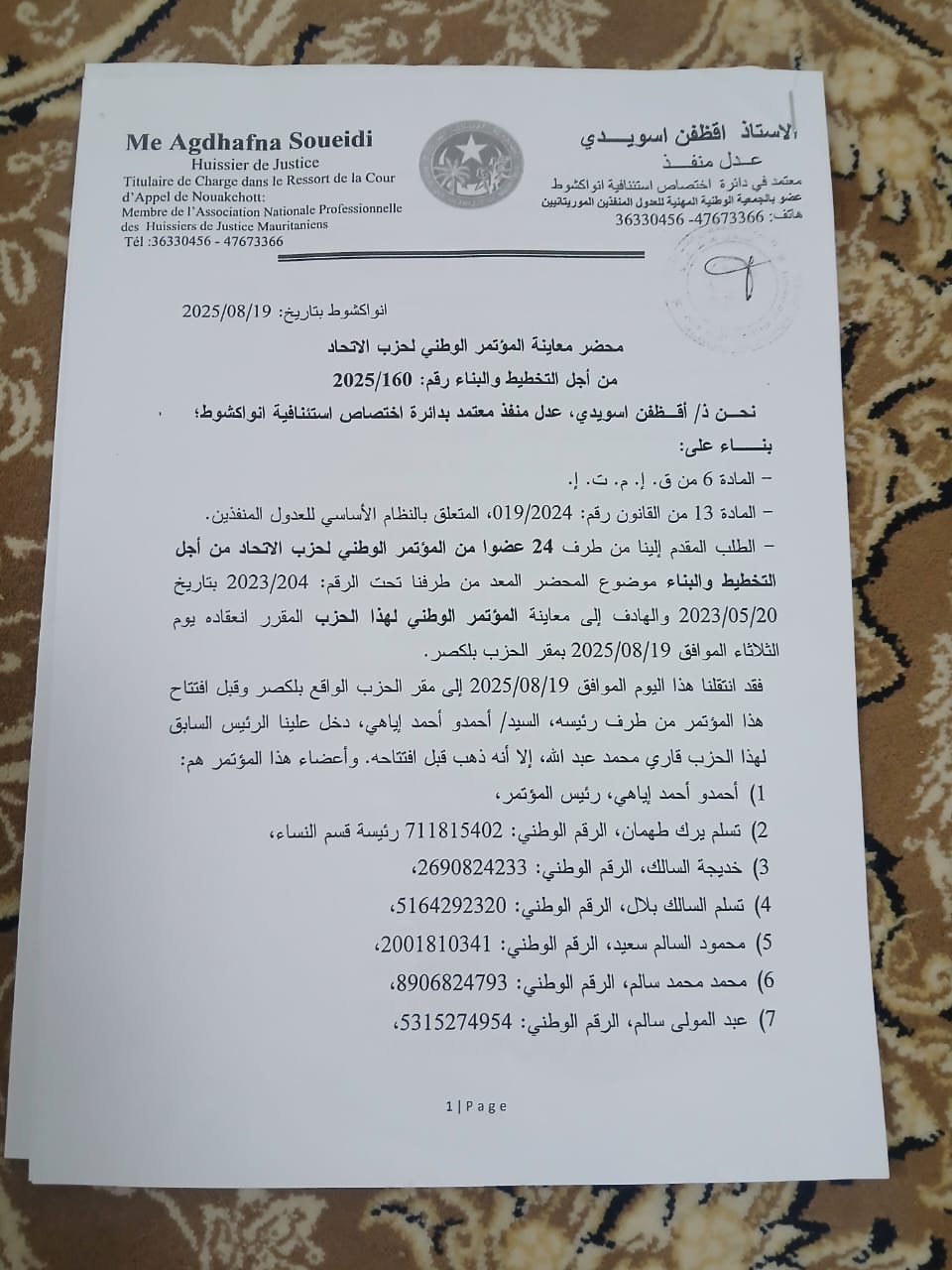 بناءا على المحضر الأخير للحزب والموثق قضائيا من طرف العدل المنفذ ذ. اغظفن ولد اسويدي بتاريخ 18/08/2025، تحت الرقم160/2025 والذي تم توزيعه على الجهات المعنية مثل وزارة الداخلية والعدل واللجنة المستقلة للإنتخابت ومنسقية احزاب الأغلبية فإن السيد قاري لم يعد رئيسا لحزب التخطيط للبناء ولايحق له التكلم باسمه فكيف به يهدد بالمتابعة قانونا بكل من ينشر عن عزله عن رئاسة الحزب هيهات فقد فات الأوان واتخذ القرار من طرف اعلى سلطة في الحزب ألا وهي المؤتمر الوطني ، ووفق النظام الداخلي والإعلان السياسي للحزب واتفاق المؤتمرين . - من كل هذا فإن القيادة الجديدة للحزب برئاسة الرئيس الجديد السيد : محمدفال أحمد إياهي ، هي وحدها المخولة قانونا بالتحدث باسمه ولن تتغاضى عن أي تجاوز قانوني بل ستتابع كل من يخالف ذلك وفق القانون والنظام الداخلي للحزب امام المحاكم .