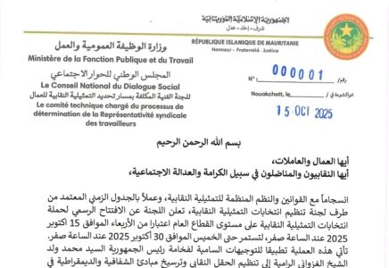 وأوضحت اللجنة، في بيان صادر اليوم الأربعاء، أن هذه الخطوة تأتي تنفيذًا لتوجيهات رئيس الجمهورية محمد ولد الشيخ الغزواني، الهادفة إلى تنظيم الحقل النقابي وترسيخ الشفافية والديمقراطية، بما يضمن تمثيلاً عادلاً للعمال ويعزز السلم الاجتماعي.