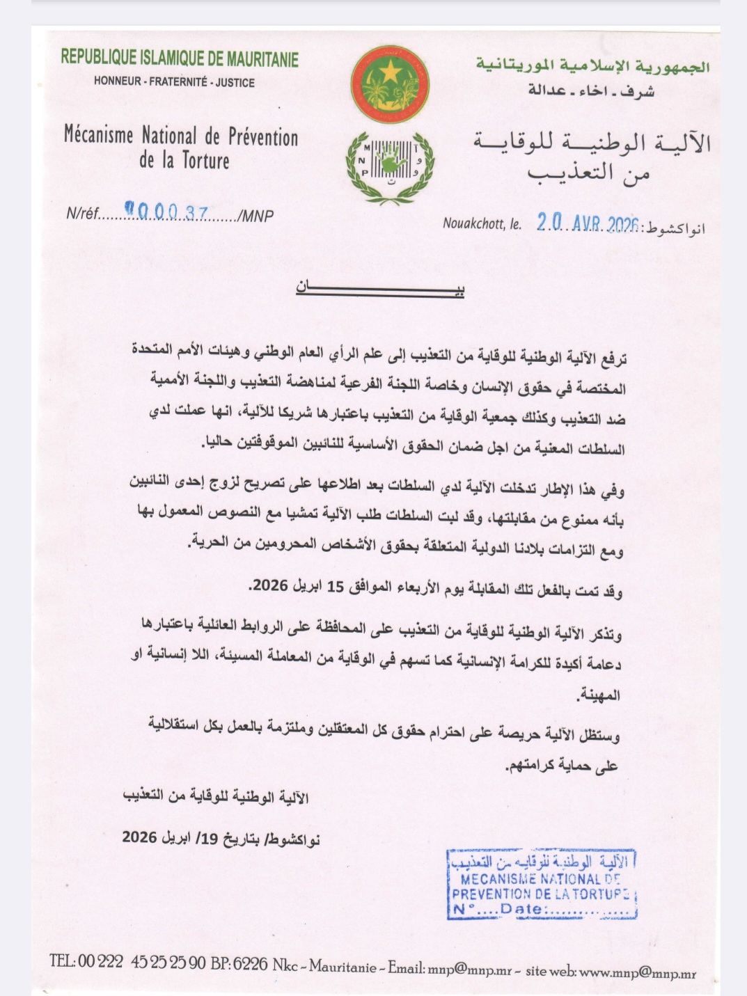 ترفع الآلية الوطنية للوقاية من التعذيب إلى علم الرأي العام الوطني وهيئات الأمم المتحدة المختصة في حقوق الإنسان وخاصة اللجنة الفرعية لمناهضة التعذيب واللجنة الأممية ضد التعذيب وكذلك جمعية الوقاية من التعذيب باعتبارها شريكا للآلية ، أنها عملت لدى السلطات المعنية من أجل ضمان الحقوق الأساسية للنائبين الموقوفين حاليا.